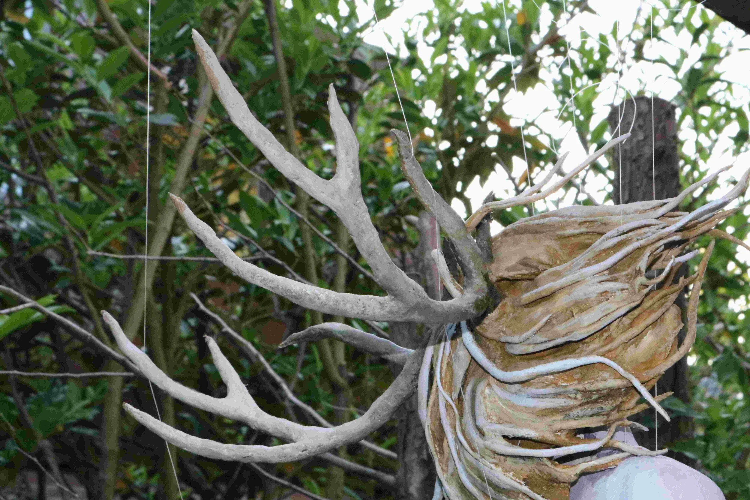 She is created with papermaché clay. The water wind swirl that circles around her, is cotton immersed with plaster. Brushed with acrylics. Stainless steel and mesh wire forms her bones.